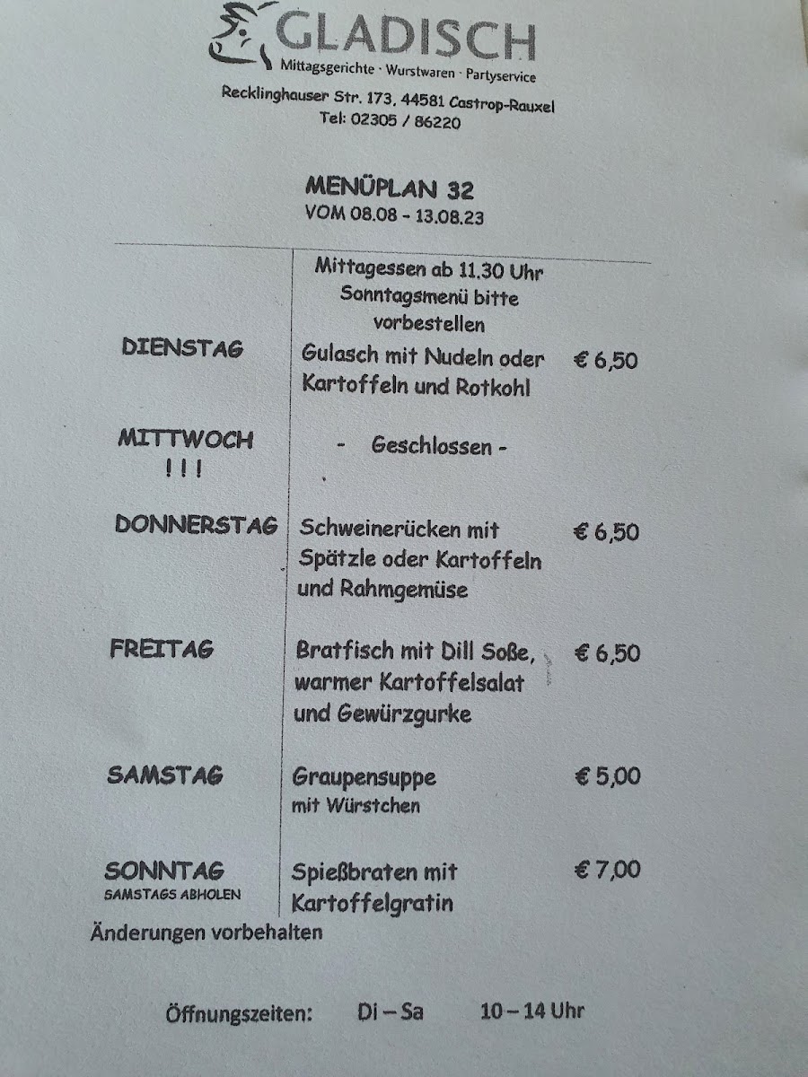 GLADISCH – Mittagsgerichte · Wurstwaren · Partyservice